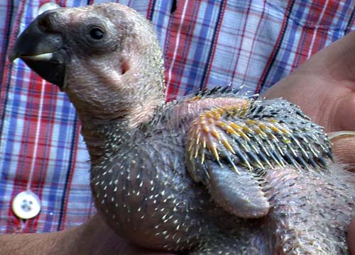 Diese Foto zeigt einen Jungvogel, bei dem die heranwachsenden gelben Federn am Flügelbug schon gut zu erkennen sind. |
