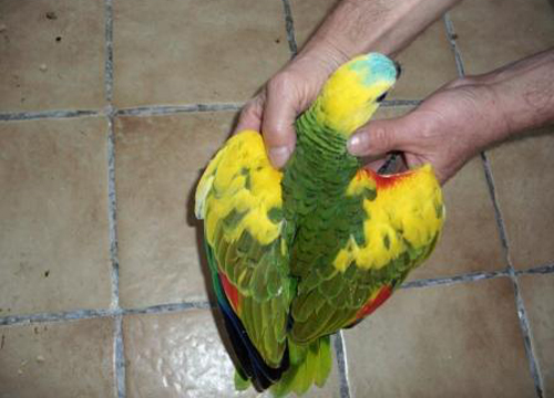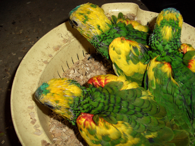 Gelegentlich ist zu hören, die ausgeprägte Gelbfärbung einiger Gelbflügel-Blaustirnamazonen würde sich erst mit zunehmendem Alter zeigen, was aber so nicht ganz richtig ist. Schon im Nestlingsalter kann man annähernd erkennen, wie die Färbung der Tiere später in etwa aussehen wird. |