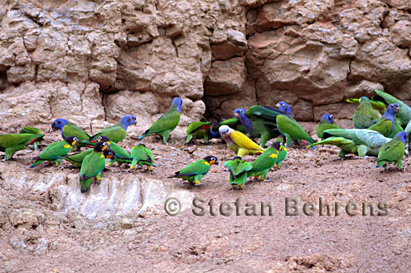 Diese Aufnahme gelang Stefan Behrens (Osnabrück) im Tambopata Researchcenter, Peru. Neben den Schwarzohrpapageien sind auf dieser Aufnahme noch eine Mülleramazone sowie Goldwangenpapageien zu sehen. |