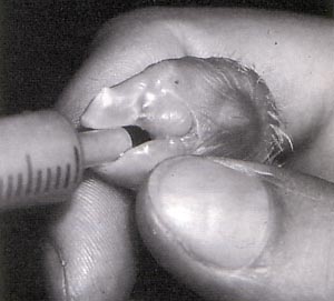 Im Vergleich zu den Schnäbeln der Alttiere sind die der Jungen sehr klein. Das Foto zeigt ein vier Tage altes Jungtier, das in der Brutmaschine erbrütet wurde. frisch geschlüpfte Jungtiere sind noch kleiner, da sie in den ersten vier tagen ihr Gewicht um ca. 30% erhöhen. Die 2-ml Spritze verdeutlicht hier sehr gut die Winzigkeit des Jungen. |